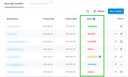 Cancelled. This is what you will see if the transfer was canceled, either by you or by the domain owner (if you are transferring a domain on behalf of someone else). You can delete it from the overview or start again.
