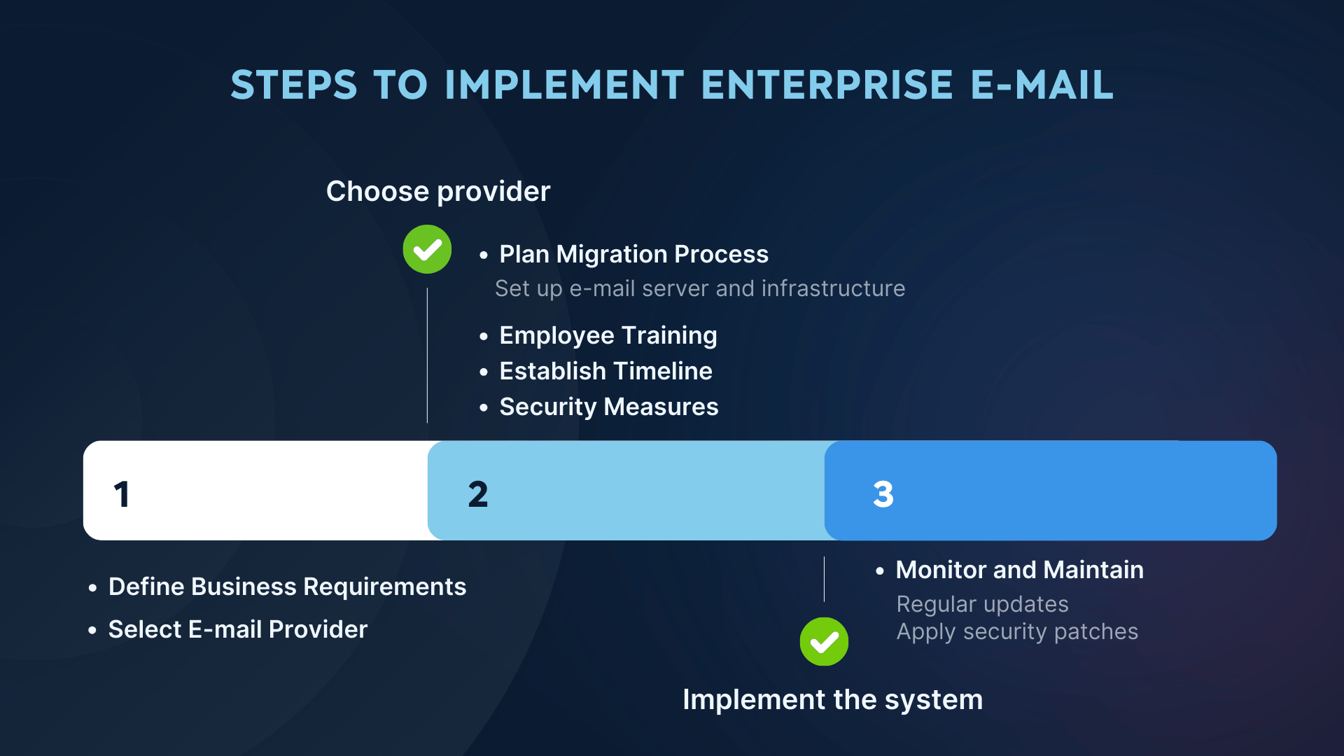 Implementing enterprise email requires careful planning and execution. Start by defining your business requirements and selecting an email provider that meets these needs. Once a provider is chosen, the next step is to plan the migration process. This includes setting up the email server and infrastructure, such as servers and storage, and ensuring compatibility with existing systems. Training is essential; employees must understand how to use the new system and be aware of any changes to email protocols. It's also important to establish a timeline for the rollout and communicate it to all stakeholders to ensure a smooth transition. Security measures must be implemented before going live, including setting up firewalls, spam filters, and data encryption. Finally, after implementing the system, continuous monitoring and maintenance are necessary to address any issues promptly and to keep the system updated with the latest security patches.